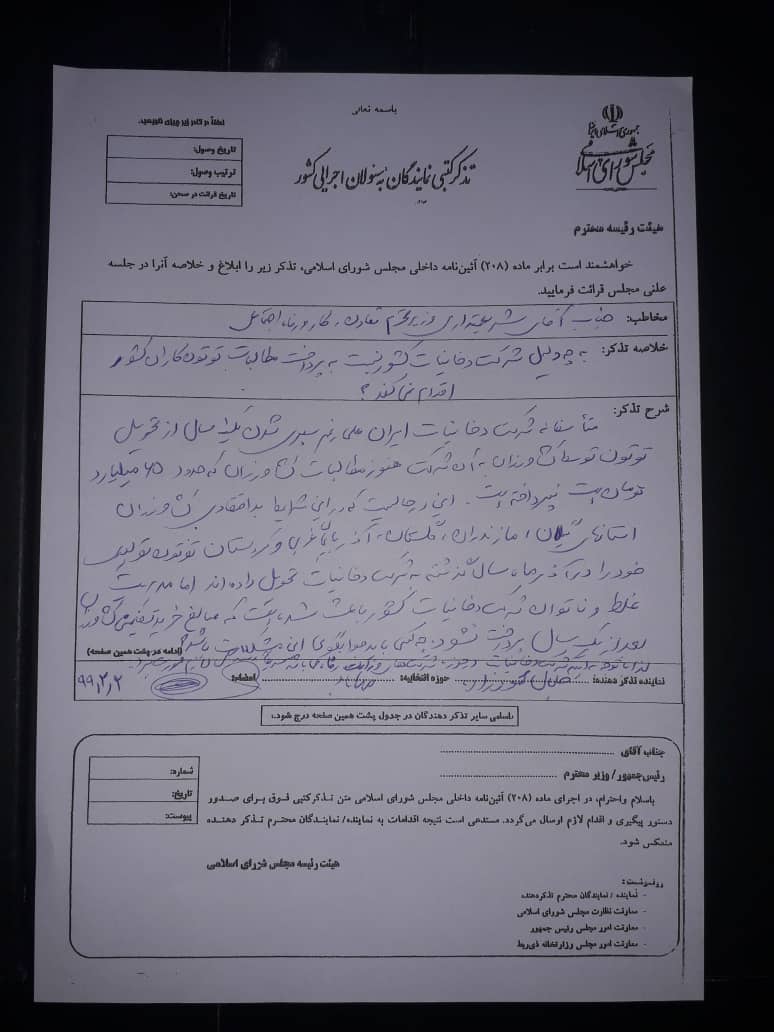 محمودزاده در تذکر کتبی به شریعتمداری خواهان پرداخت 65 میلیارد تومان بدهی شرکت دخانیات به کشاورزان شد.